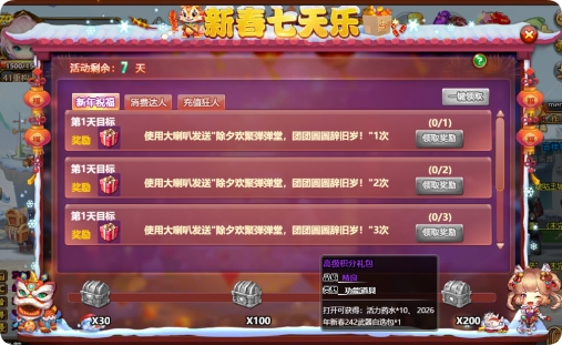 1月16日 | 使用大喇叭发送" 骏马迎春马上躺赢"2次 | 新年宝箱1*1(打开可获得:年夜饭宝箱*1,并随机获得灵魂石*10,灵魂石*30,灵魂石*3000中的一项) |